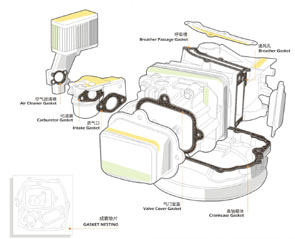 1、空氣濾清器(Air cleaner gasket) 2、化油器(Carburetor gasket) 3、進(jìn)氣口(Intake gasket) 4、氣門(mén)室蓋(Valve cover gasket) 5、通風(fēng)孔(Breather gasket) 6、呼吸槽(Breather passage gasket) 7、曲軸箱體(Crankcase gasket) |