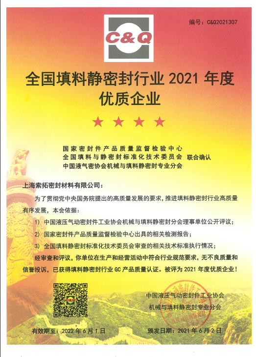 我司獲得全國填料靜密封行業2021年度優質企業稱號